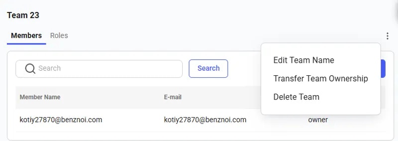 The Transfer Team Ownership feature allows an owner to seamlessly reassign the team to another member within it. To do so, navigate to the Members page and click the three-dot menu in the upper right corner.
