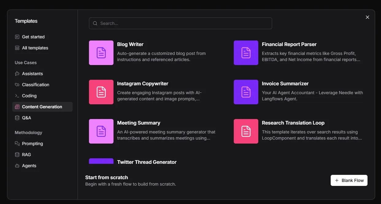 After opening Langflow, click the ‘Create first flow’ button. While Langflow is extremely powerful, for this example we will create a simple blow post writer. Select Content Generation -> Blog Writer Initially, the flow will look like this